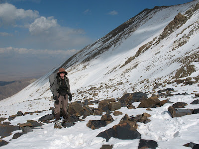 No one told us it was a good idea to try to get to the Saimaluu Tash petroglyphs. Everyone said that it was way past the season, and way too cold. But those who know me, know how much I love petroglyphs and that I would not be too easily deterred. Saimaluu Tash is a collection of over 100,000 ancient petroglyphs high up in a mountain bowl. To get there, Tim and I would have to take a taxi from Jalala Bot over a mountain pass to a small village, then a four wheel drive up a jeep road, and finally hike 12 kilometers into a mountain bowl. The morning we had arranged to take the taxi brought bad news. The pass we had to drive over was closed due to a storm. Tim looked at our map and found another possible route. We would take a taxi to a small village this side of the mountain range, hike 35 kilometers up a valley and go over a pass by foot. After this, we would drop back down into the bowl where the petroglyphs are located. We reached the village and the taxi driver offered to take us as far as he could up the narrow road, ultimately shaving 15 kilometers off of our journey. We then began walking. The nomads were on there way out of the high country with their sheep, horses, and cows while we were on our way in. They kept saying to us "mnoga snic, mnoga snic". Much snow, much snow. We did not see that much snow, so we kept hiking. A Russian lady invited us for tea and fed us lunch, with chickens running around our feet begging. Yes, begging! The next morning a snow storm moved into the valley. Hoping that it would stop snowing and melt off, we hiked a miserable three hours before setting up camp, where we remained that day and the next. The fourth day dawned bright and clear, and hope began to return. We hiked to look at the route and saw that the snow was melting fast. We decided to give it the day to melt, and hike to the petroglyphs the next day. The following day we climbed up the pass, and back down to the petroglyphs. There was a foot of snow on the north side where the petroglyphs were, but they are carved on black rocks so they were partially melted out and visible. We trudged around in a foot of snow for three hours in our tennis shoes looking at them and finally hiked back to camp when we thought our feet would fall off from cold. The snow covered boulder field was treacherous, and we spent much of the time post holing with one leg, while the other banged forward onto the rocks. The petroglyphs were wonderful, though, and very well preserved due to the remote location. We saw mountain sheep, horses, dogs, Ibex, plows, people dancing, shooting bow and arrow, and other various carvings. Leaving the valley the next day with hardly any food left, we got lucky again, and caught a ride out of the valley with a Kirghiz nomad family moving into town for winter with everything they owned in a huge truck - including a donkey. We helped them load up. All of their worldly belongings consisted of the donkey, a puppy, a bunch of quilts, a hand made wool rug, several huge wooden crates of apples, a wood burning stove, a few buckets, pails, and pots, and a plastic clock wrapped carefully in a towel. They did not ask for money, but we gave them 500 som (about 15$). Way too much, but we were happy to get a ride, and I am sure that the truck they drove ate up petrol like crazy.